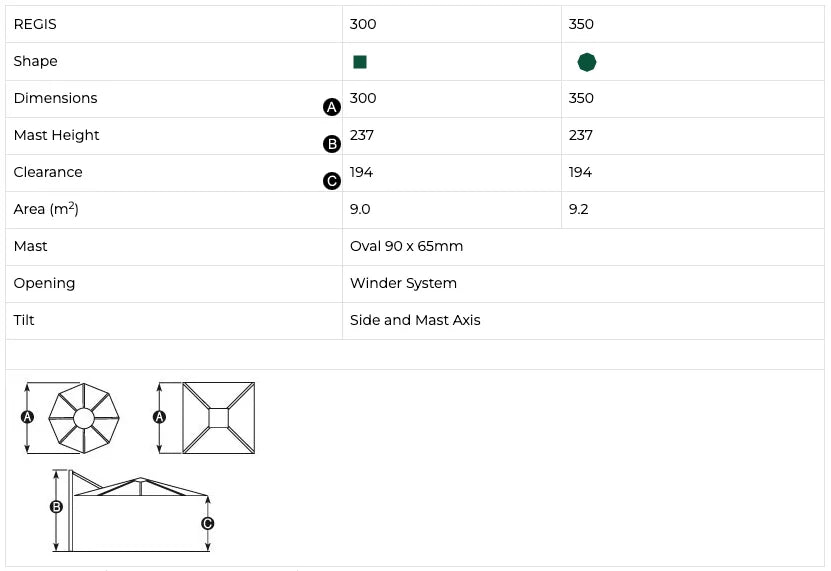 Regis is Shelta's important mid-size / mid-price Cantilever. It uniquely featured side axis winder handle controlled tilt - to 75 degrees to either side; as well as normal mast axis tilt. Regis has all other Shelta Cantilever attributed - winder handle opening and closing, 360 degree rotation around the mast (to give shade where needed), LED light mount and compatibility with Shelta's Large and Extra Large wheeled resin bases. Includes Polyester Protective Cover.