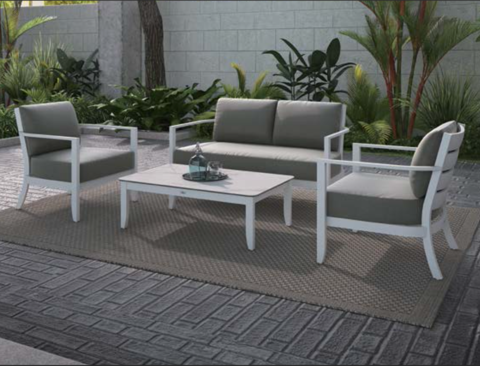 The Saratoga setting is the perfect staple for any outdoor area. It includes two single seats, a double seat and a ceramic glass top coffee table that comes in two colour ways.