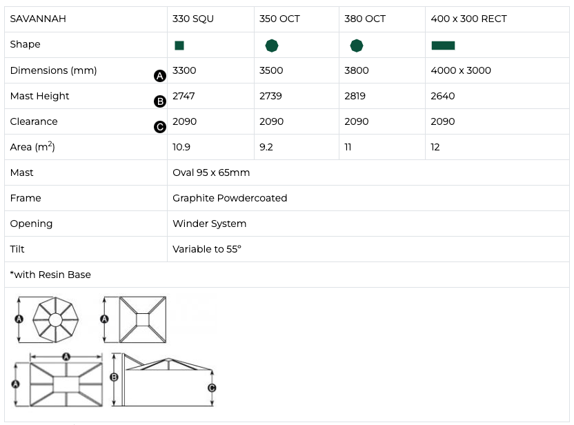 The Savannah features a number of design innovations, including a drop down bracket on the umbrella hub for LED light attachment. Most importantly, Savannah is covered in fade resistan properties, exceeded only by Sunbrella acrylic. Savannah has an impressive oval section mast and a 360 degree rotate (with foot lock), press button tilt lock, crank lift opening and resin base options. Includes Protective Cover.